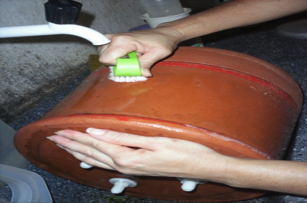 No caso da limpeza dos bebedouros de barro, a principal recomendação é realizá-la utilizando apenas escova de cerdas plásticas e bicarbonato de sódio (nunca se deve usar produtos químicos como detergente ou sabão). Após esfregar as paredes com bicarbonato de sódio o bebedouro deve ser enxaguado com água limpa em abundância.