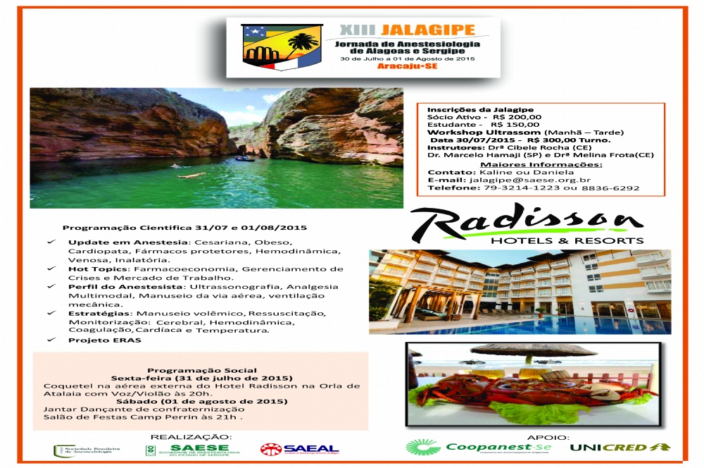 Especialista de todo o país estarão em Aracaju entre os dias 30 de julho e 01 de agosto, para a “XIII Jornada de Anestesiologia de Alagoas e Sergipe” (Jalagipe). Realizado pela Sociedade Brasileira de Anestesiologia e pelas Sociedades de Anestesiologia de Sergipe (Saese) e Alagoas (Saeal), o evento tem como objetivo debater as novidades da área através de palestras, seminários e workshop.