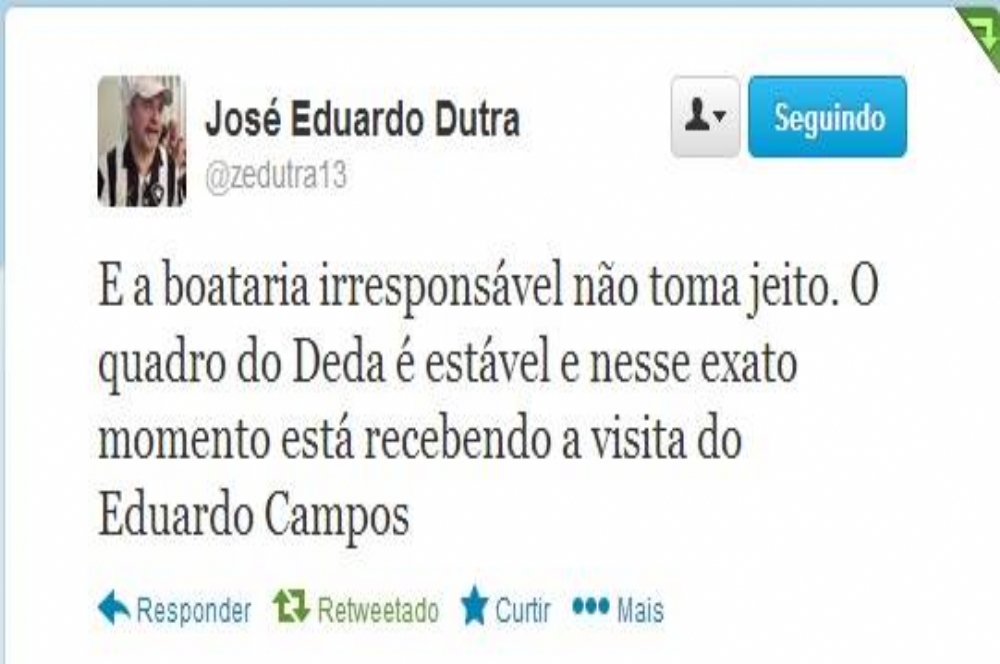 “E a boataria irresponsável não toma jeito. O quadro do Deda é estável e nesse exato momento está recebendo a visita do Eduardo Campos”, destaca referindo-se ao governador de Pernambuco.
