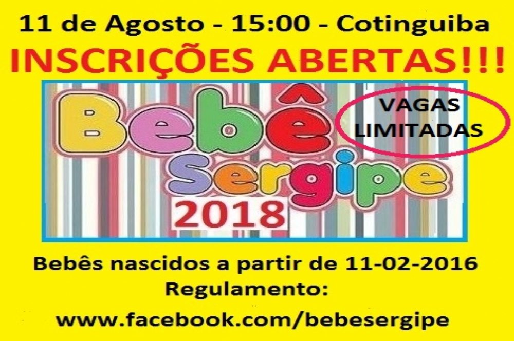 Estão abertas as inscrições para o concurso Bebê Sergipe 2018, que vai acontecer no dia 11 de agosto de 2018, às 15 horas, no Salão Nobre do Cotinguiba Esporte Clube, em Aracaju.