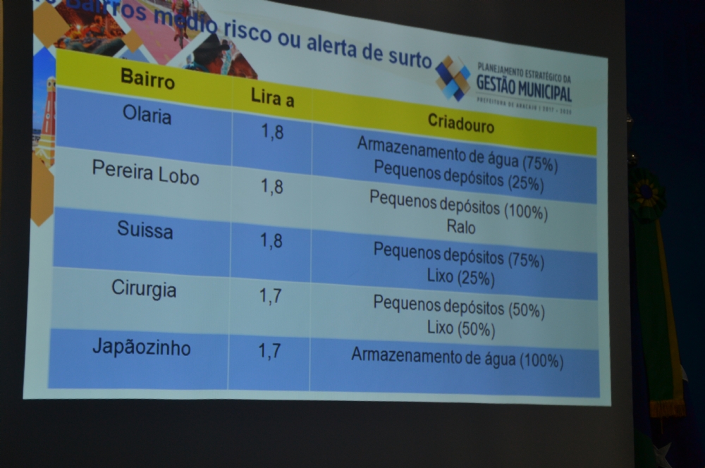 Segundo o prefeito, 65% dos bairros apresentaram índices de infestação predial suportáveis, abaixo de 1%, mas há ainda 35% dos bairros com índices superiores a 1%, áreas classificadas de risco médio. Em Aracaju, conforme o prefeito, não há áreas consideradas de alto risco.