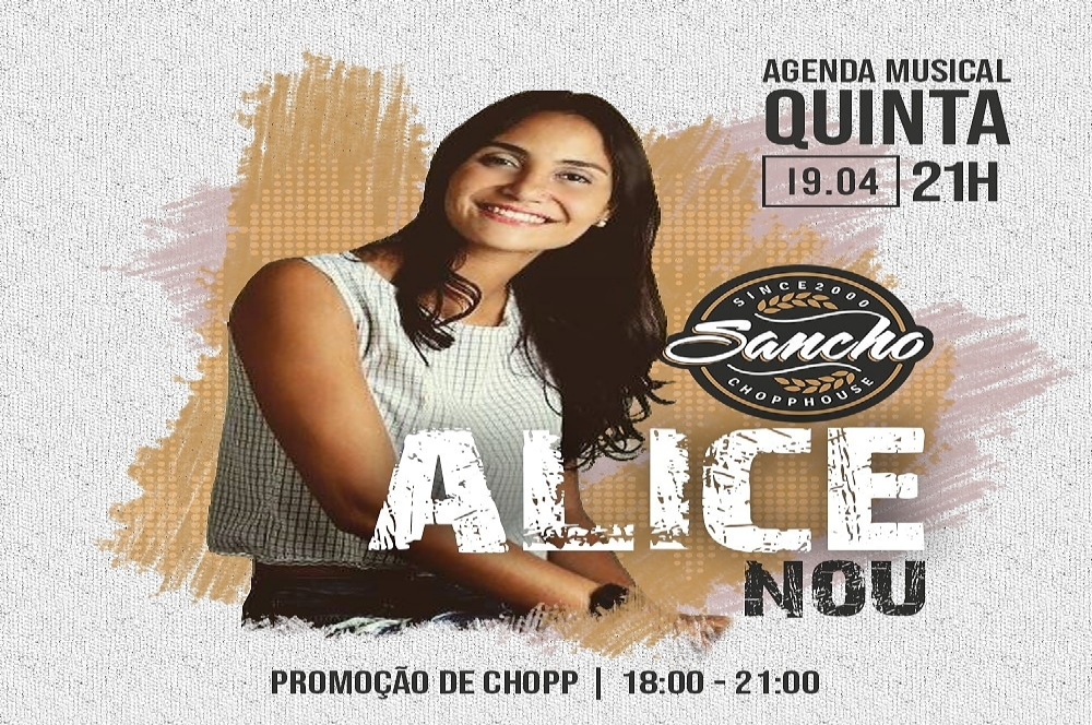 Hoje, 19 de abril, a cantora e compositora Alice Nou apresenta um repertório para lá de especial para quem gosta de MPB, Pop rock, reggae e internacional.