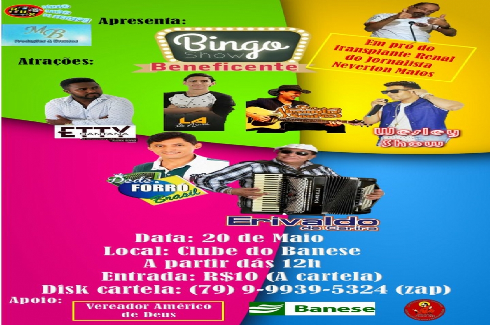 O Clube do Banese sedia no dia 20 de maio, um Bingo Show Beneficente. A ação é em prol do transplante renal do jornalista Neverton Matos. O show acontece ao meio dia e as cartelas podem ser encontradas por apenas R$ 10.