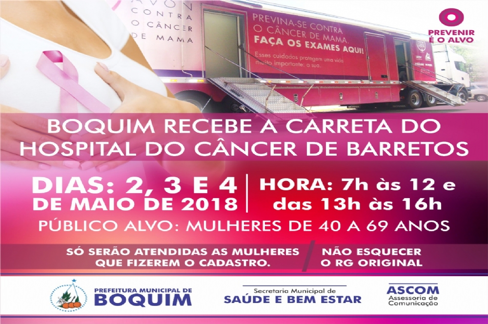 Com o objetivo de identificar o câncer de mama precocemente, nos próximos dias 2, 3 e 4 de maio, a Prefeitura de Boquim, através da Secretaria de Saúde e Bem Estar, traz para o município a Carreta da Prevenção do Hospital do Câncer de Barretos. A unidade móvel ficará na Praça Desembargador Rinaldo Costa e Silva e atenderá no total 144 mulheres, na faixa etária de 40 a 69 anos de idade. Em cada dia a Carreta fará 48 atendimentos, das 7h às 12h e das 13h às 16h.