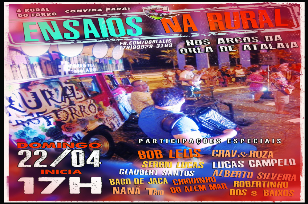 Neste domingo, 22, a partir das 17h nos Arcos da Orla de Aracaju, acontecerá outra edição dos "Ensaios na Rural". No evento, o artista Bob Lelis comandada a festa que reúne voluntariamente grandes artistas sergipanos em apresentação cultural para o público presente na Orla de Atalaia.