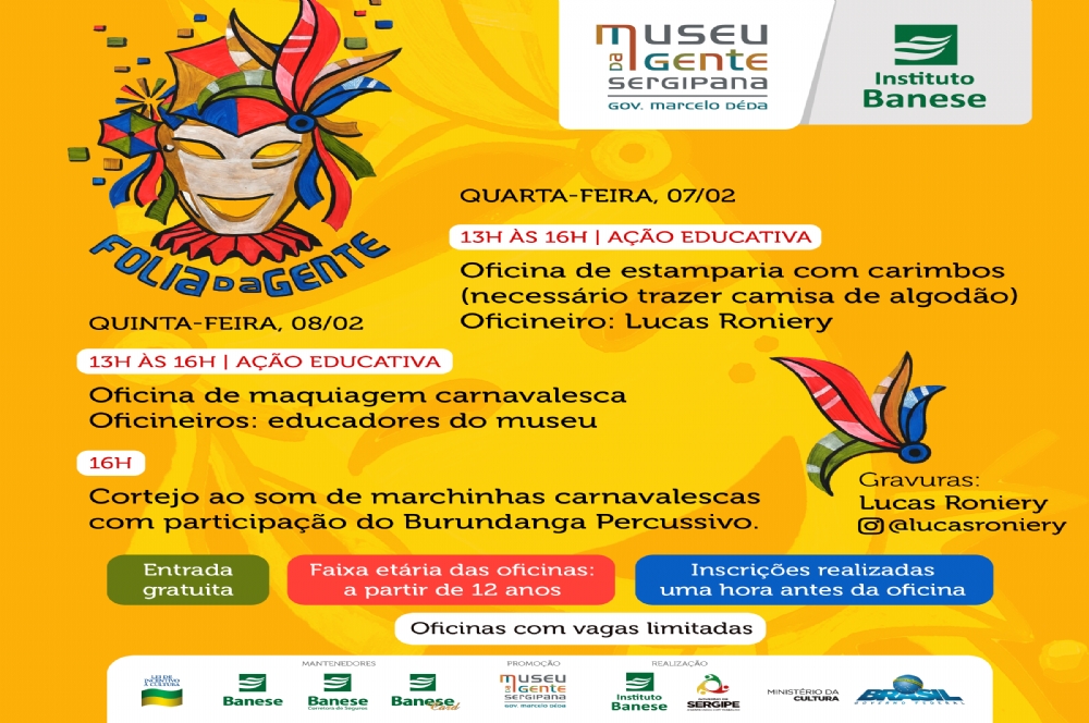 No Museu da Gente Sergipana Governador Marcelo Déda tem folia marcada para os dias 07 e 08 de fevereiro, amanhã e quinta, com oficinas e cortejo ao som de marchinhas carnavalescas. Será mais uma edição da Folia da Gente, realizada pelo Instituto Banese, através do Museu da Gente Sergipana, com o intuito de proporcionar o encontro de sergipanos, turistas, crianças, adultos e toda família com manifestações populares que remetem ao carnaval tradicional e às culturas populares.
