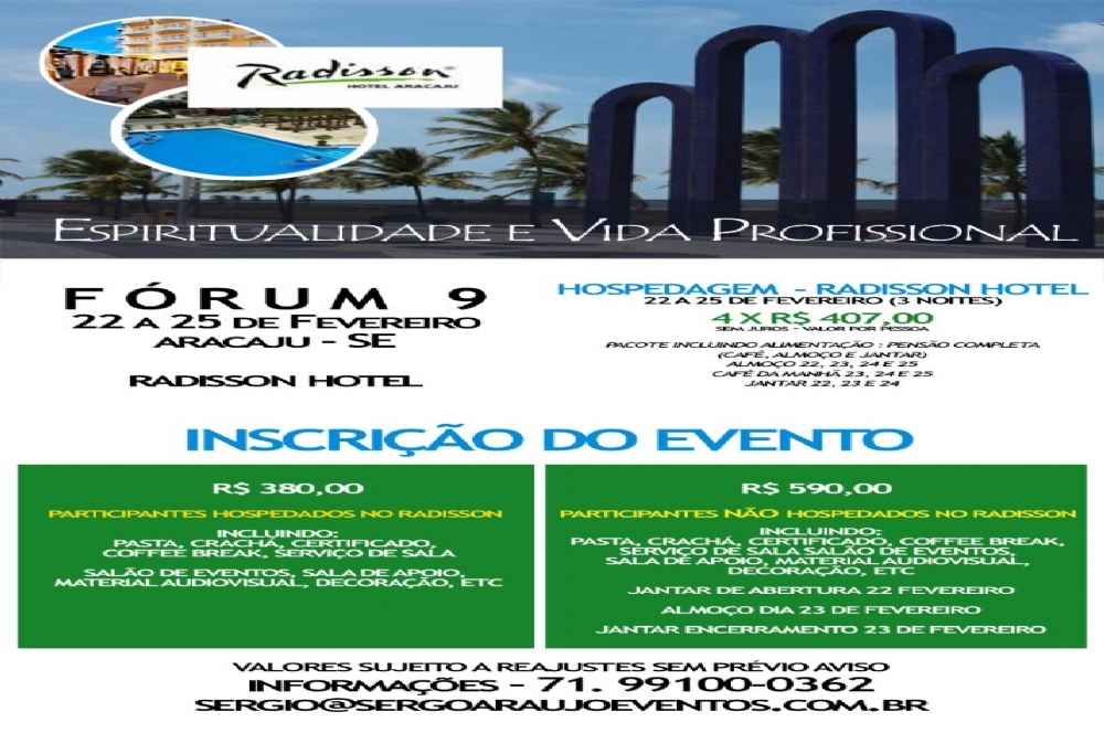 Aracaju sedia entre os dias 22 e 25 de fevereiro, a 9ª edição do Fórum Espiritualidade e Vida Profissional. O evento acontece no Hotel Radisson na Orla de Atalaia. Desde 2010, o evento debate a espiritualidade nos diversos espaços da sociedade atual como espiritualidade na família, com o próximo e o ser espiritualista.