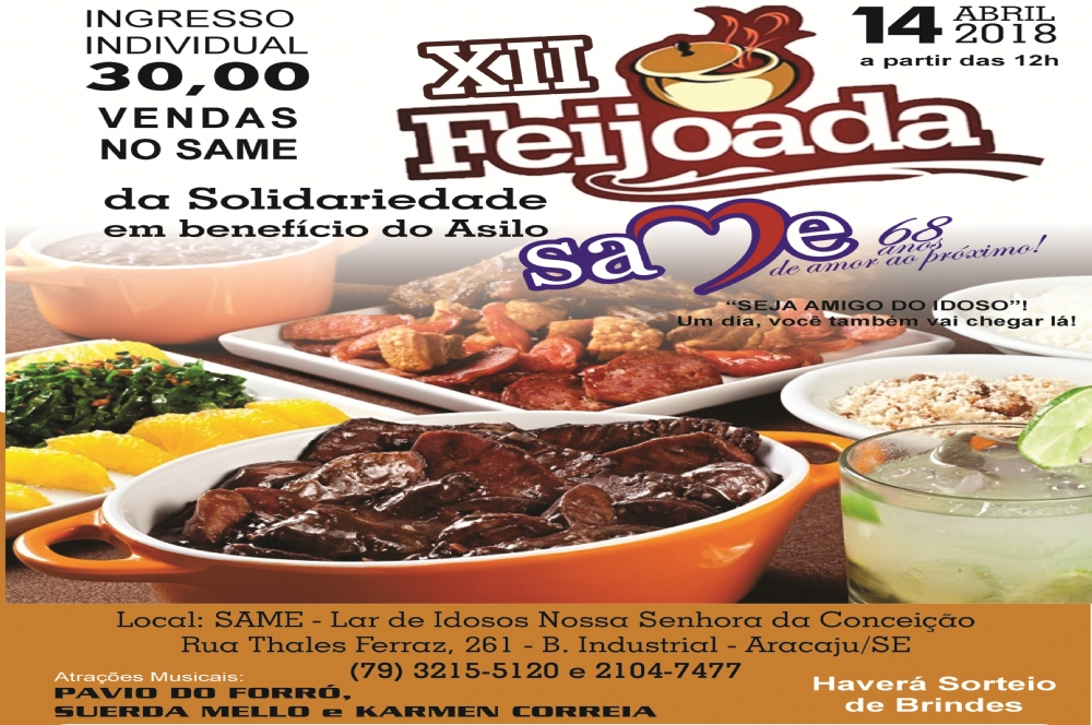 No próximo dia 14 de abril, a partir das 12h, o Lar de Idosos Nossa Senhora da Conceição (SAME) realiza a 12ª Feijoada Solidária.