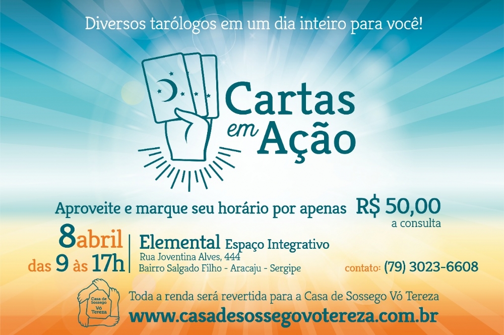 Será realizado no próximo domingo, dia 08 de abril, a primeira versão do projeto “Cartas em Ação”, com diversos tarólogos reunidos para consultas de cartas em prol da construção da Casa de Sossego Vó Tereza. A ação será realizada das 9h às 17h, no espaço Elemental Espaço Integrativo, Rua Joventina Alves, 444, Bairro Salgado Filho – Aracaju – SE e as consultas poderão ser agendadas pelo telefone (79) 3023 – 6608.